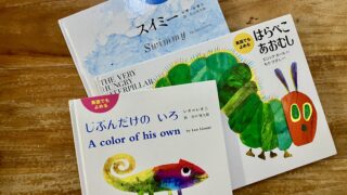 英語版と日本語版の両方で楽しめる定番絵本3冊を紹介。はらぺこあおむし、スイミー、じぶんだけのいろなど、おうち英語の導入に最適な名作を分かりやすくまとめました。